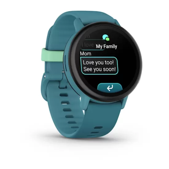 With an active subscription, you can use the Garmin Jr. app to send text messages to your child’s Bounce 2 smartwatch. Kids can create their own messages and respond with a full on-device keyboard, including emojis or sound emojis, to parent-approved contacts and in family group messages.